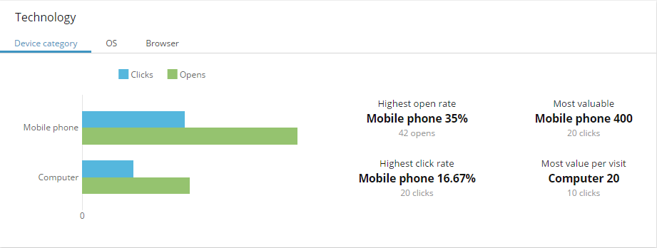 The Device category tab displays the number of opened email campaigns and the number of clicks grouped by device, operating system, or browser that the contacts have used. In addition, you can see:
