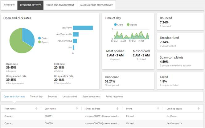 Recipient activity – shows details about the open rate and clicks that your email campaign has generated, and information about bounces, spam complaints, and unsubscribes.