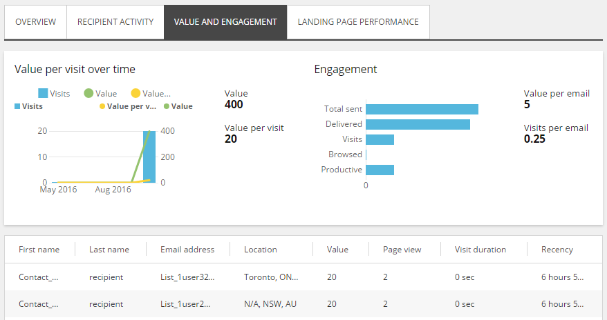 Value and engagement – shows the value per visit over time and the engagement value that your email campaign has generated.