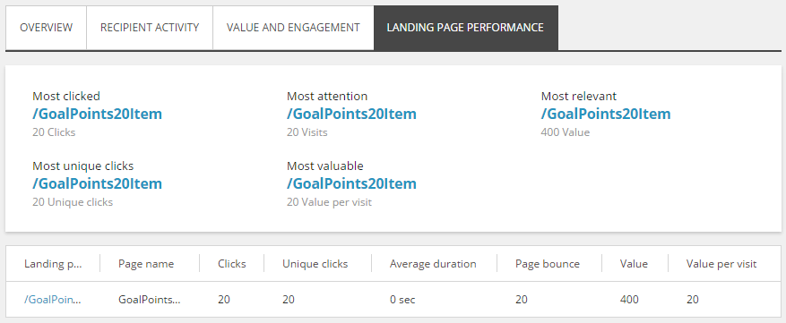 Landing page performance – shows details about the landing pages that your email campaign directs the recipients to, for example, the most clicked, most valuable, or most relevant.