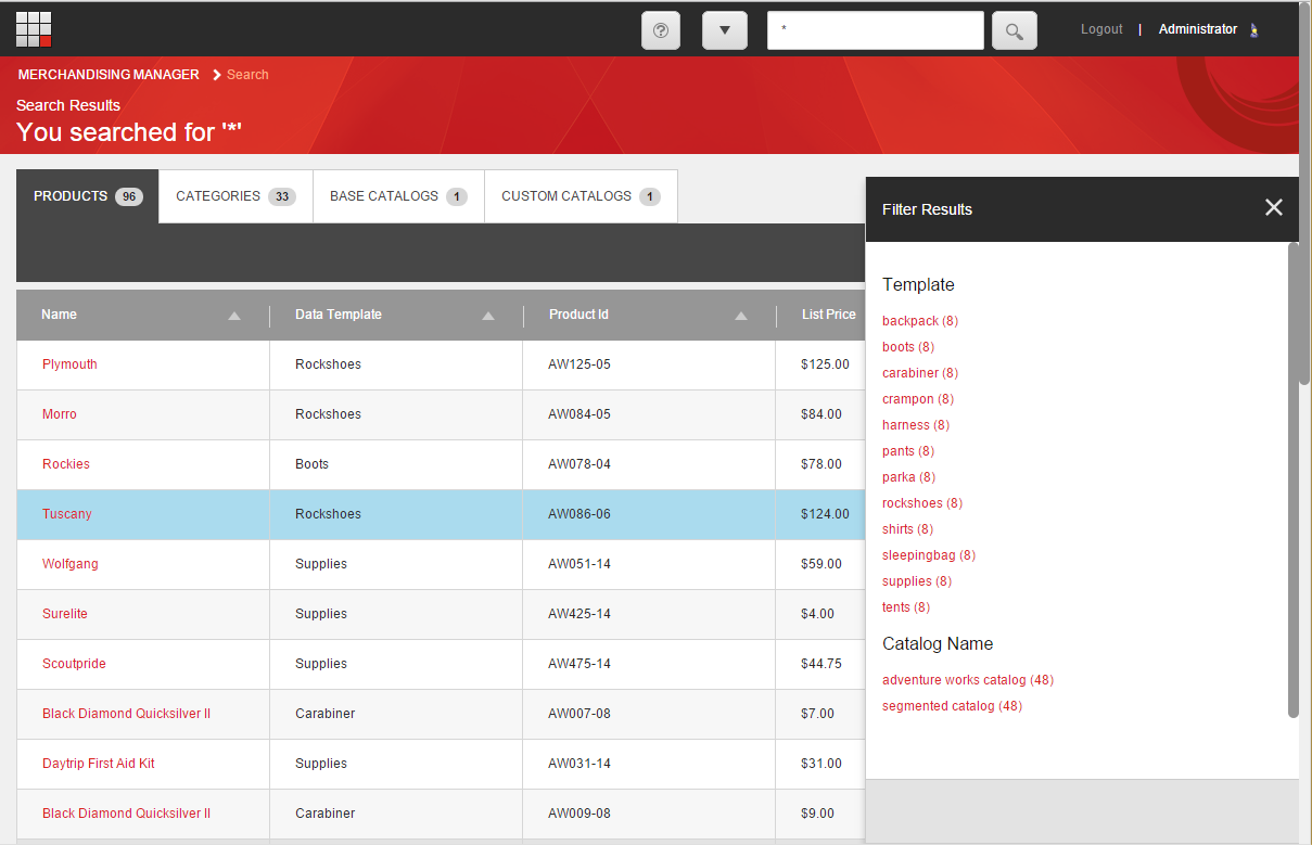 The content area displays content items as search results.The Merchandising Manager displays list items in a table, sorted by tabs. You can activate each tab in turn, allowing for operations on the items in the content area. Each row of the table contains a list item and associated metadata by column. List items are sortable.