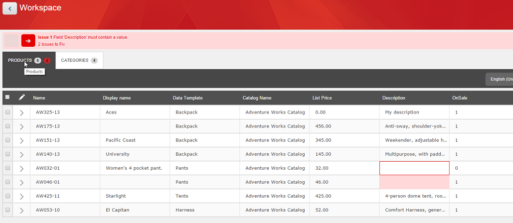 Workspace alerts you if there are issues or errors with the changes that you have made. When you save your work in Workspace, Sitecore validates any changes you made to Products, Categories, Relationships, and Variants. If there are validation errors, a message appears in the upper left corner of the Workspace.