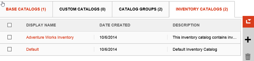 The Inventory catalogs tab contains a listing of all the inventory catalogs contained on the site. The Inventory catalogs tab details the following properties: