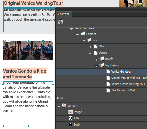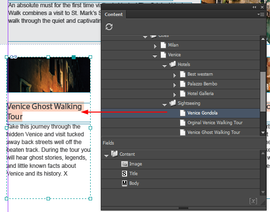 In the Content panel, select the content item and drag it to the group on your InDesign page. For example, add a different activity to a page of a travel brochure.