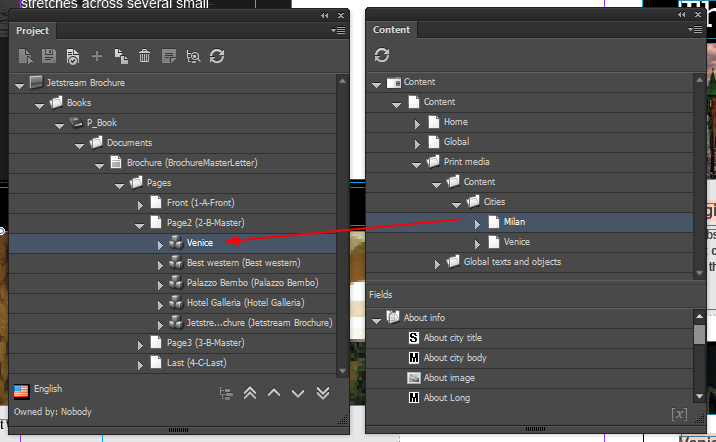 In the Content panel, select the Sitecore content item and drag it to the snippet or page in the Project panel. For example, you can change the introduction section on the page of a travel brochure to describe a different city.
