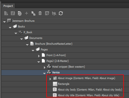 If you need to change the content for many different items, you can assign a Sitecore content item to a snippet or a page in the project structure. A snippet in IDC is a collection of content items (text frames, images, and so on) that is saved in the project structure of a document in Sitecore. Assigning new content to the snippet or page in the Project panel changes all the content items that are part of the snippet or page.